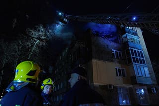 Pictured: Firefighters work at the site of an apartment building hit by a Russian drone strike in Chernihiv
